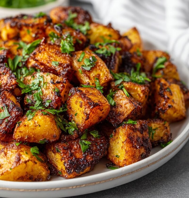 For Crispy Garlic Roasted Potatoes: Wash and dice 2 russet potatoes. Toss with 1 tablespoon olive oil, garlic powder, paprika, and salt. Spread on a baking sheet and roast for 30–35 minutes, stirring halfway, until golden and crisp.