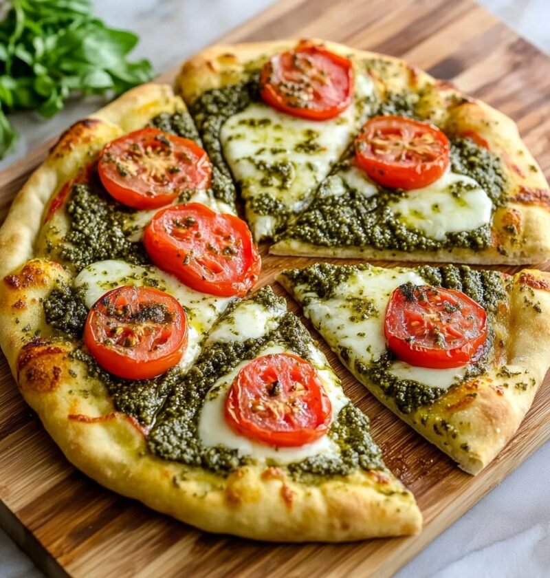 A classic Neapolitan-inspired pizza topped with vibrant homemade basil pesto, fresh mozzarella, and a golden, chewy crust. This delicious Italian-style meal is perfect for dinner or sharing with friends.