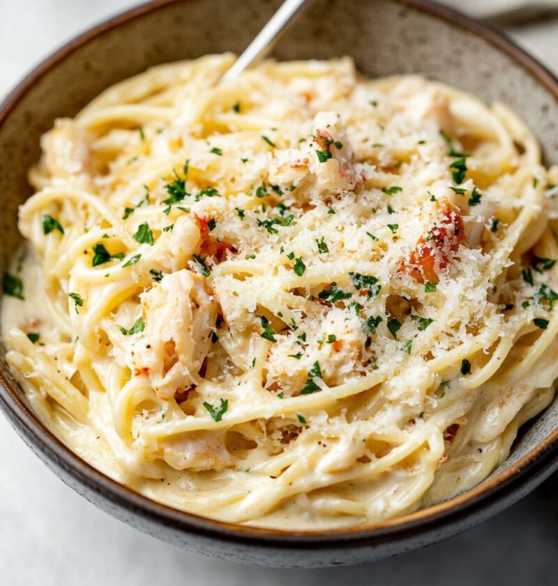 Crab Pasta is best enjoyed freshly made, served hot, and presented elegantly in shallow pasta bowls. Garnish with a generous sprinkle of freshly chopped parsley, extra Parmesan cheese, and a wedge of lemon for squeezing, which adds a pop of brightness to each bite.