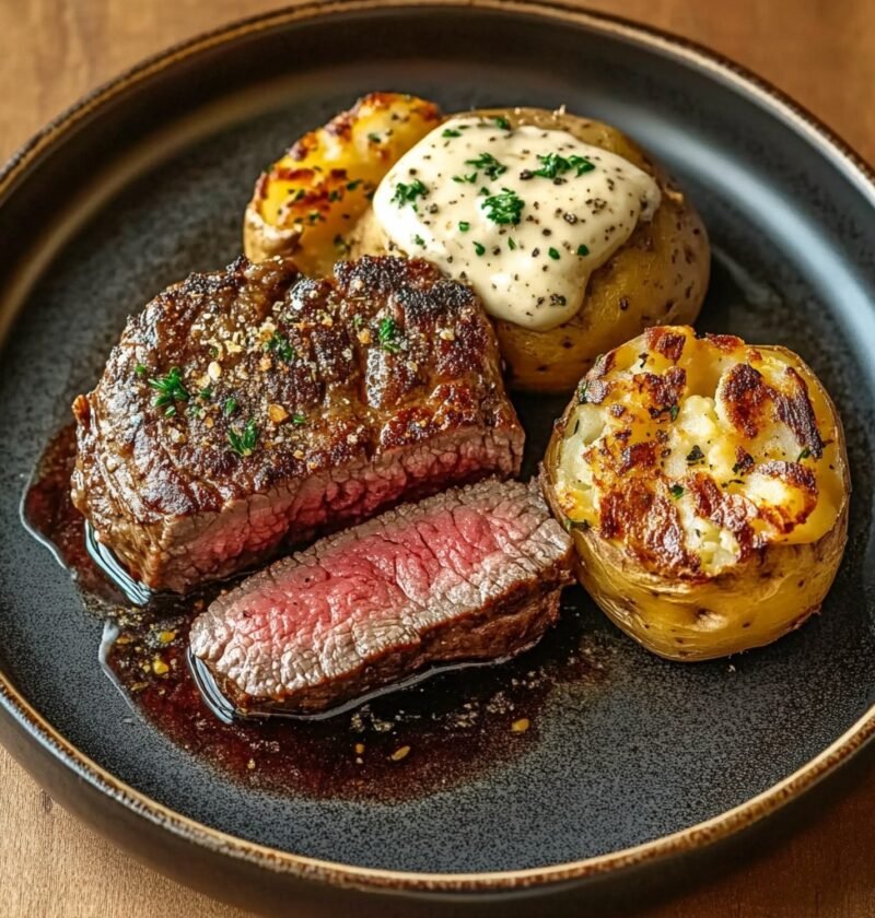 Pair the main dish with a simple green salad or light steamed vegetables such as broccoli or green beans, which provide a crisp, refreshing contrast to the rich, hearty flavors of the potato and steak.