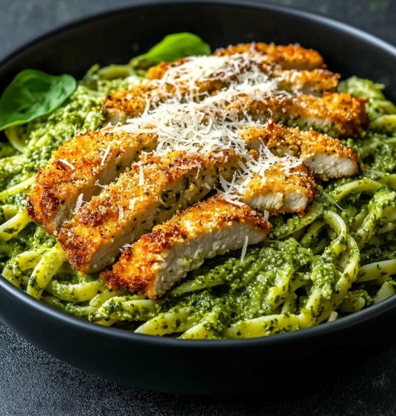 Pesto Pasta with Crispy Parmesan Chicken is a standout Italian-inspired dish that seamlessly blends the aromatic flavors of freshly made pesto with the irresistible crunch and savoriness of Parmesan-crusted chicken.